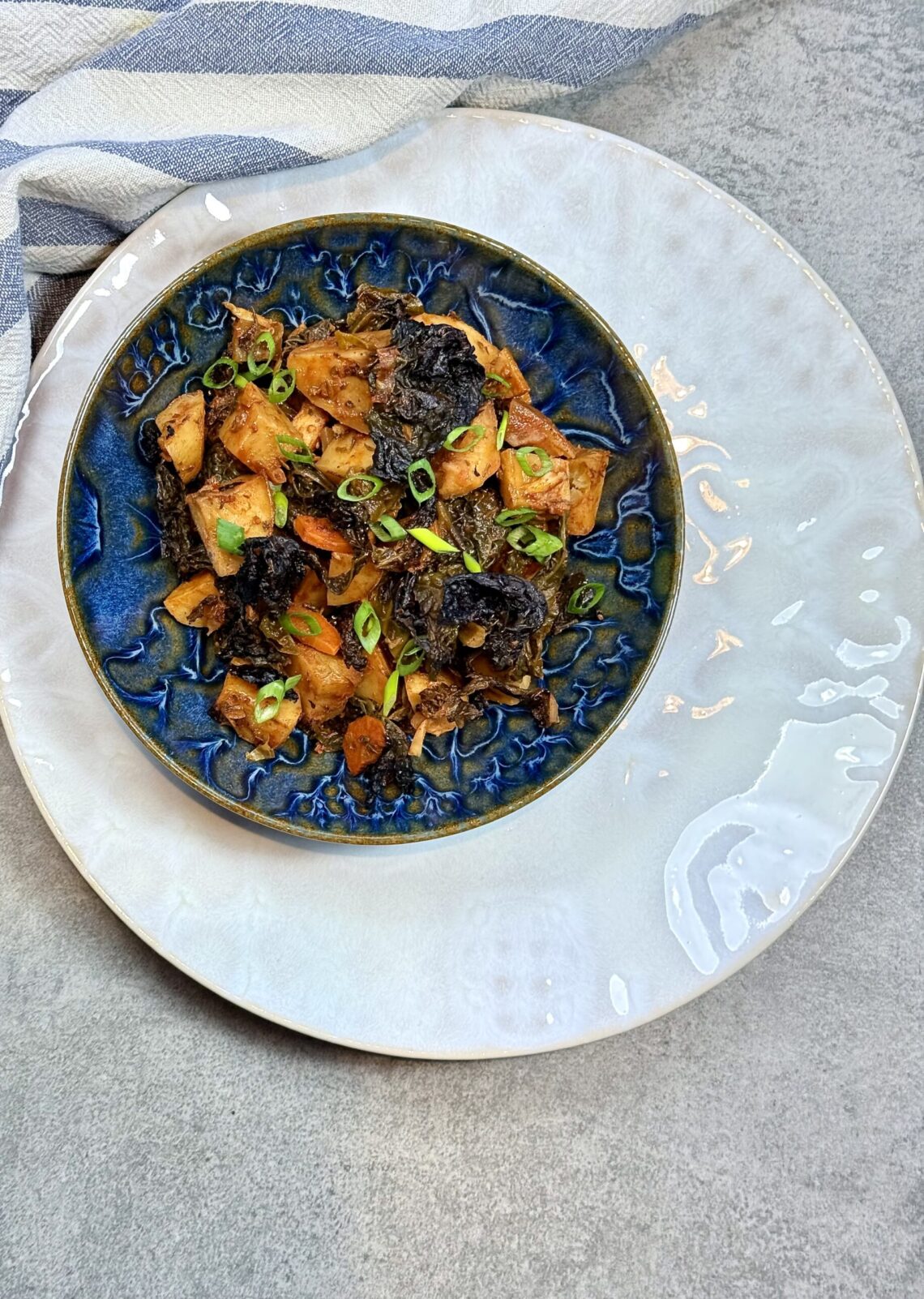 | Zubereitungszeit: 20-30 Minuten Backzeit: ca. 1-1,5 Stunden Portionen: 2 Zutaten: 5 Blatt Wirsing 4 Kartoffeln 1 kleine Karotte ca. 200 g Sellerie 2 Frühlingszwiebeln 1 Knoblauchzehe (oder 1 TL Knoblauchöl, oder 1/2 TL Knoblauchpulver, je nach Verträglichkeit kann es auch weggelassen werden) 125 ml milder Verjus (weniger, wenn der Verjus sehr sauer ist, aber lasst ihn nicht weg, da er essentiell für den Geschmack ist!) 125 ml Wasser 2 EL Paprikapulver, edelsüß 1,5-2 TL Salz 1/4 TL weißer Pfeffer 1 EL histaminfreie italienische Kräuter (z. B. Oregano, Thymian, Basilikum, Rosmarin, Bohnenkraut, Lorbeerblätter) 2 EL Öl (z. B. Olivenöl oder Rapsöl) Zubereitung: 1. Entferne den Strunk der Wirsingblätter, halbiere sie und schneide sie in feine Streifen. 2. Die Kartoffeln, Karotte, Sellerie und Frühlingszwiebeln klein schneiden. Etwas des grüne Endes der Frühlingszwiebeln für die Garnitur beiseite legen. 3. Das geschnittene Gemüse in eine Auflaufform geben. Die Knoblauchzehe durchpressen und dazugeben. Alle Gewürze sowie Verjus und Wasser hinzufügen. 4. Alles gut vermischen, sodass das Gemüse gleichmäßig bedeckt ist. Die Auflaufform in den kalten Ofen stellen. 5. Den Ofen auf 220°C (Umluft) stellen und das Gemüse 35 Minuten mit einem Deckel oder einer anderen Abdeckung backen (zB ein anderes Blech oder eine Silikon Matte). 6. Nach den 35 Minuten das Gemüse umrühren und ohne Abdeckung für 15 Minuten weiter backen. 7. Danach erneut umrühren und weitere 15 Minuten backen, bis die gewünschte Knusprigkeit erreicht ist. (Ich backe normalerweise 3×15 Minuten für besonders knusprigen Kohl, es kommt aber auch auf eure Ofenform drauf an und wie dich das Gemüse geschlichtet ist) 8. Das fertige Gericht servieren und genießen! Tipp: 1. Du kannst das Gemüse bereits am Vormittag vorbereiten, oder wann auch immer du mehr Energie hast. Dann einfach im Kühlschrank aufbewahren und später im Ofen backen. Achte darauf, dass geschnittenes Gemüse schneller Histamin bildet, aber bei richtiger Lagerung im Kühlschrank bleibt der Histaminspiegel niedrig. Wenn du sehr empfindlich bist, bereite es frisch zu. 2.Ich benutze diese Grundzutaten: Paprikapulver, Verjus, Italienische Kräuter und weißer Pfeffer in sehr vielen Rezepten, da es so gut zusammen funktioniert und je nach dem welches Gemüse oder welche Zubereitungsart (Ofen, Druckkochtopf, Pfanne,etc) man wählt, schmeckt es doch immer wieder anders 😀 Dies hat natürlich auch den Vorteil, dass ich nicht viel nachdenken muss, weil egal was im Kühlschrank ist, mit diesen paar Zutaten schmeckt es eigentlich immer! Also probiert es einfach aus und werdet Kreativ. Nährwerte pro Portion (geschätzt): Kalorien: ca. 280 kcal Eiweiß: 6 g Kohlenhydrate: 50 g Fett: 6 g Ballaststoffe: 8 g |